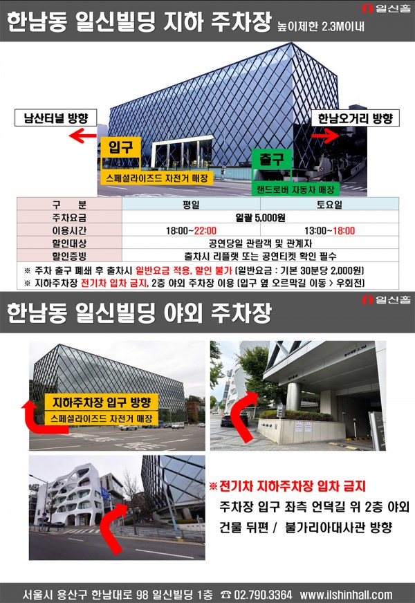 주차장 이용 및 금액은 어떻게 되나요? 페이지 정보 작성자 일신홀 작성일18-05-31 11:30 조회27,277회 댓글0건 관련링크 이전글 다음글 목록 본문 주소 : 서울시 용산구 한남대로 98(한남동 714) 일신빌딩 1층 Tel : 02-790-3364 이전글 다음글 목록